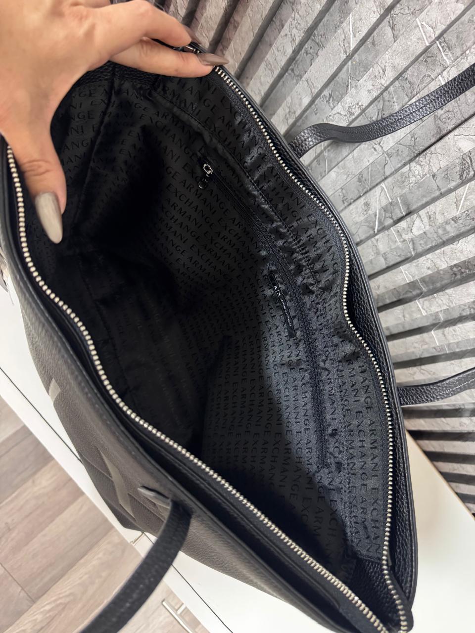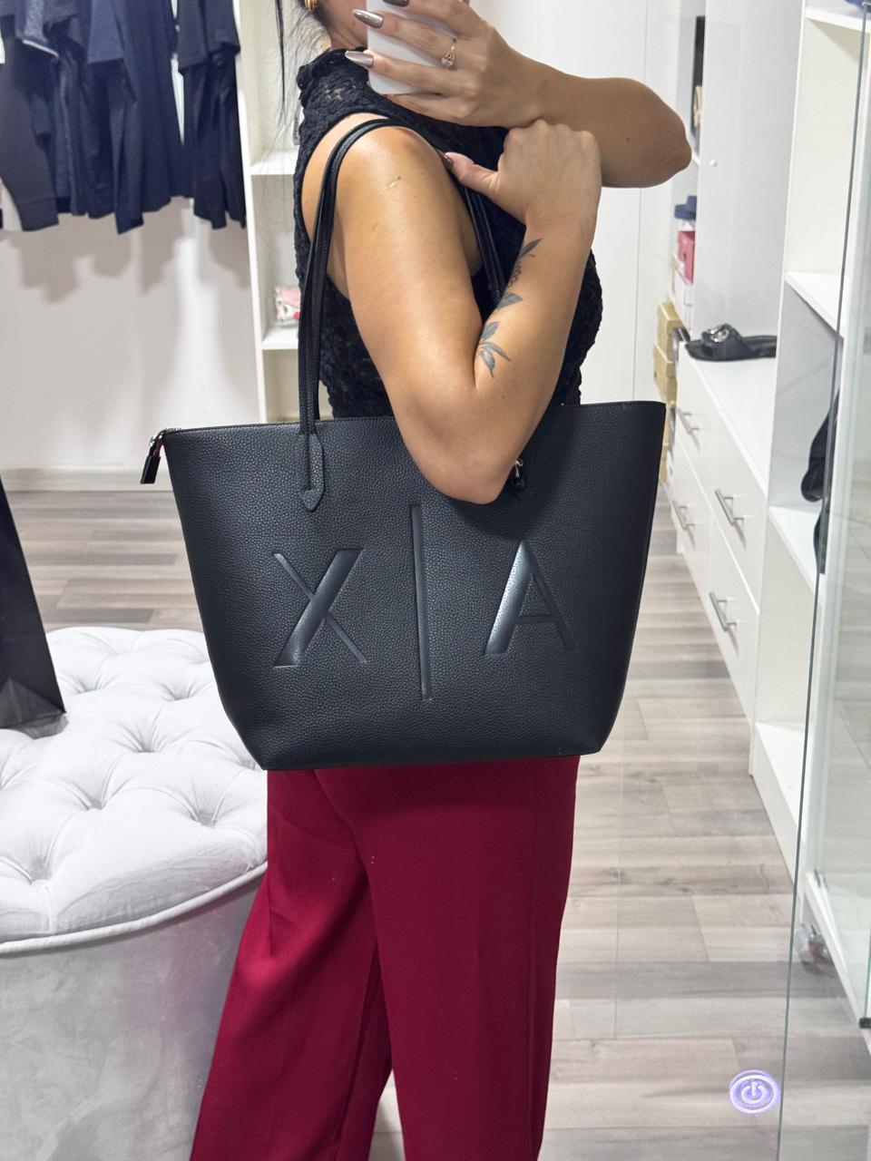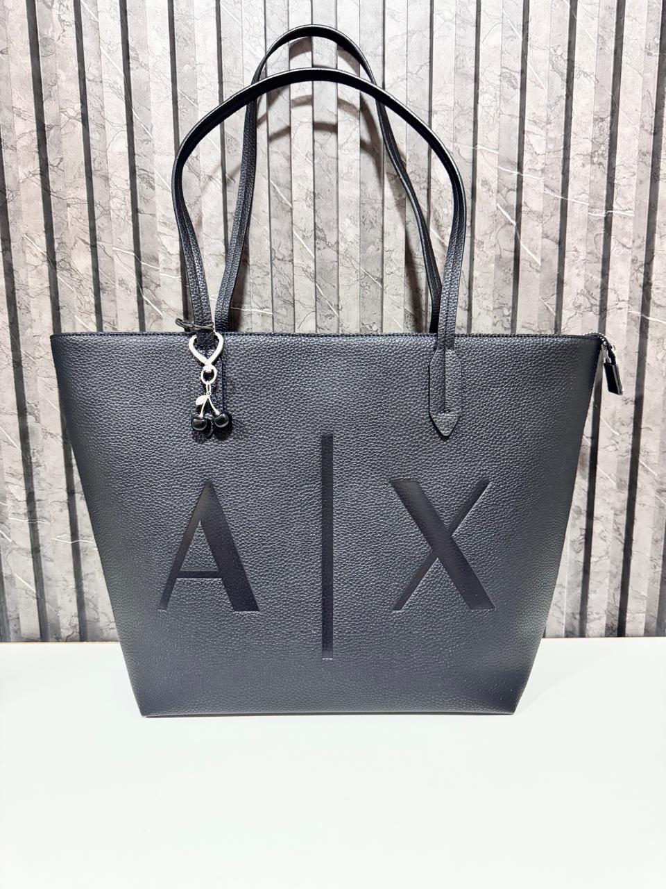 Cartera de hombro Armani color negro, incluye bolsa guarda polvo y charm de regalo.