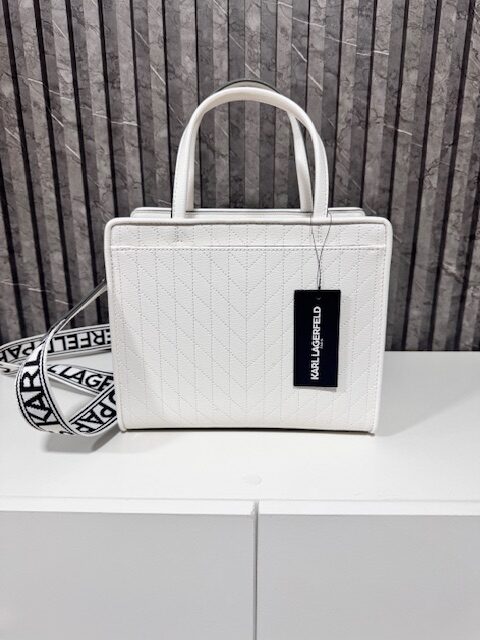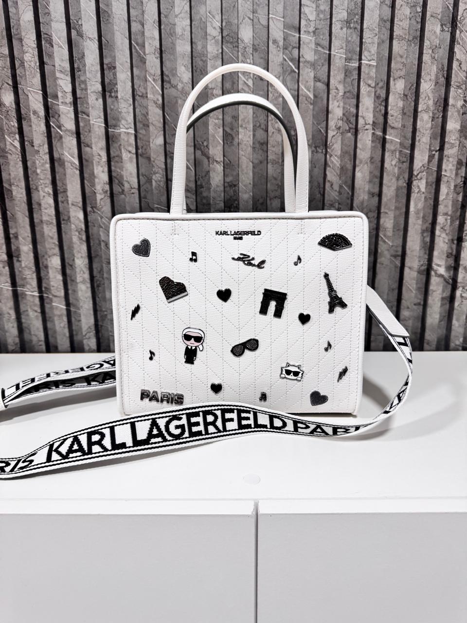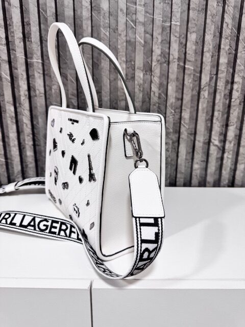 Cartera blanca con pines, tirantes ajustables y removibles que puedes usar de mano o cruzada.