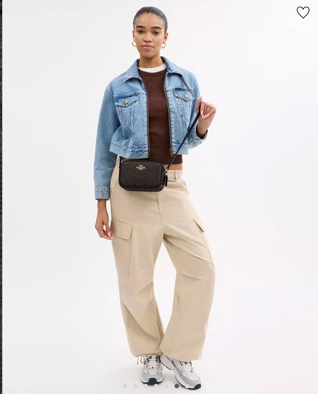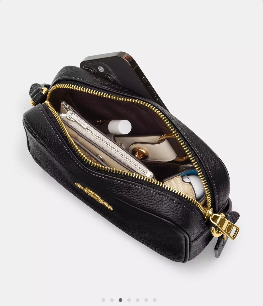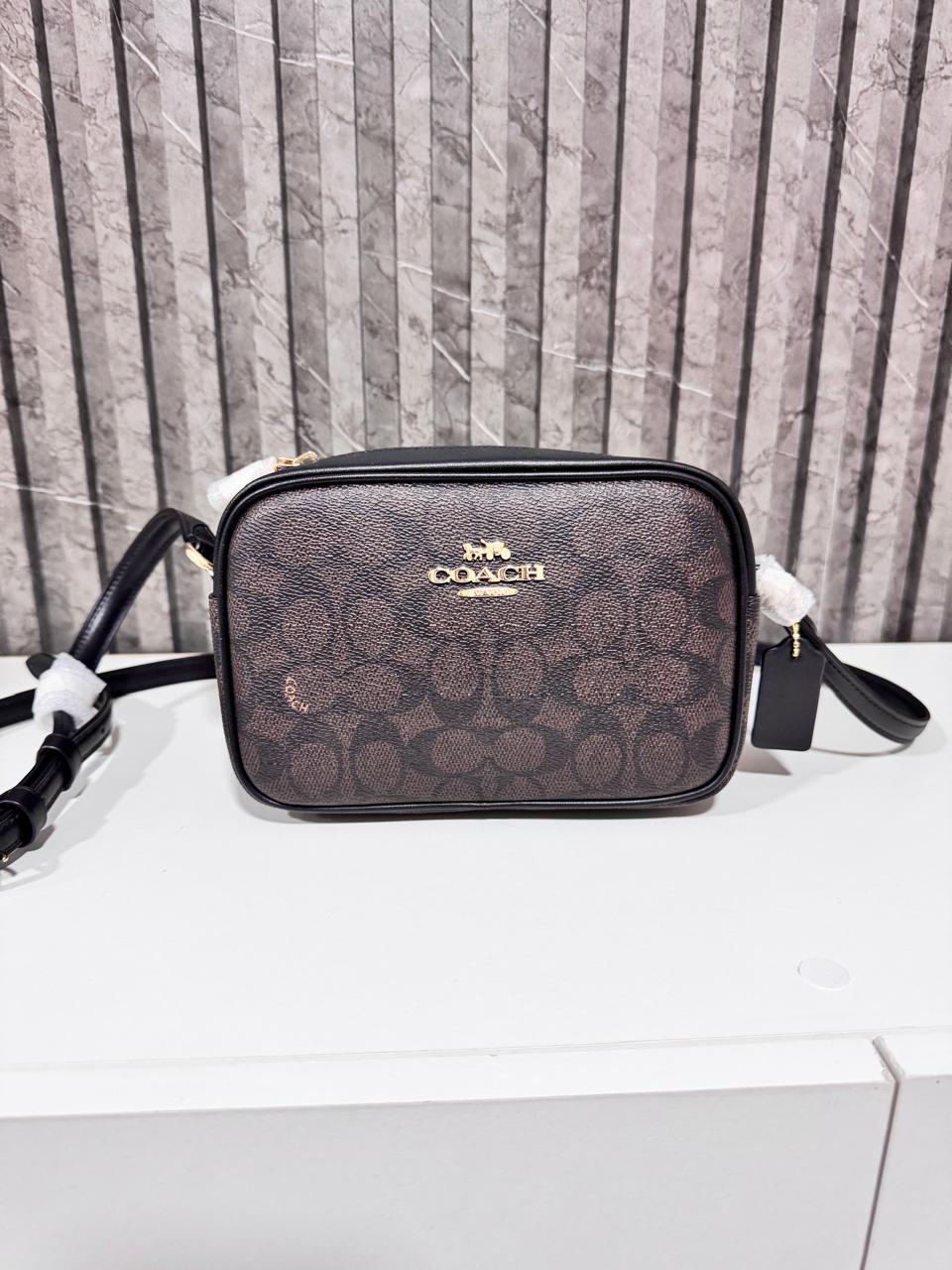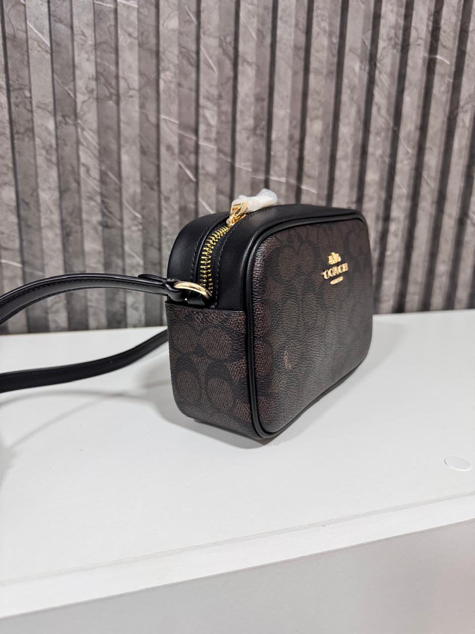 Crossbody Coach de cuero macromado, cafe con negro, correa ajustable