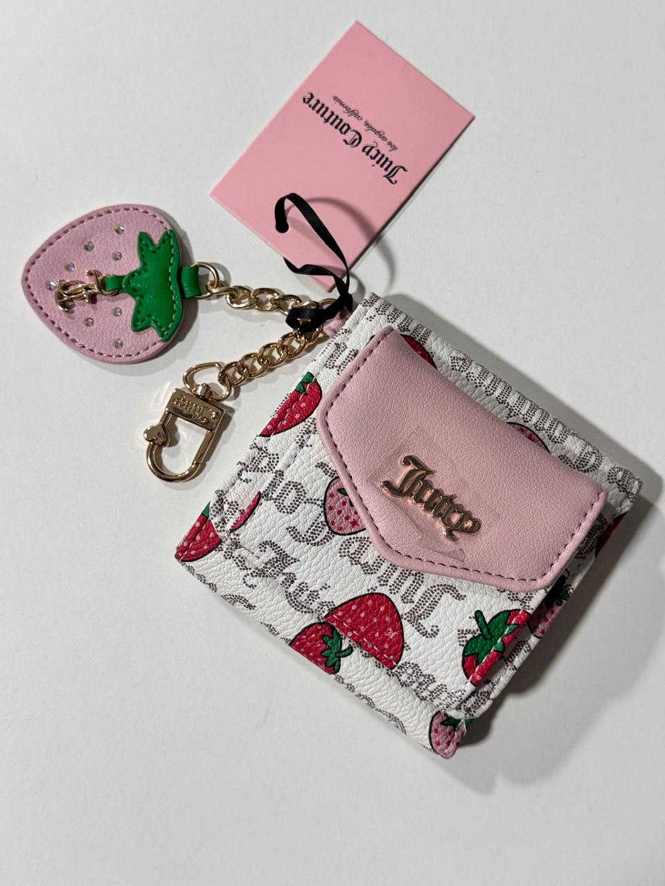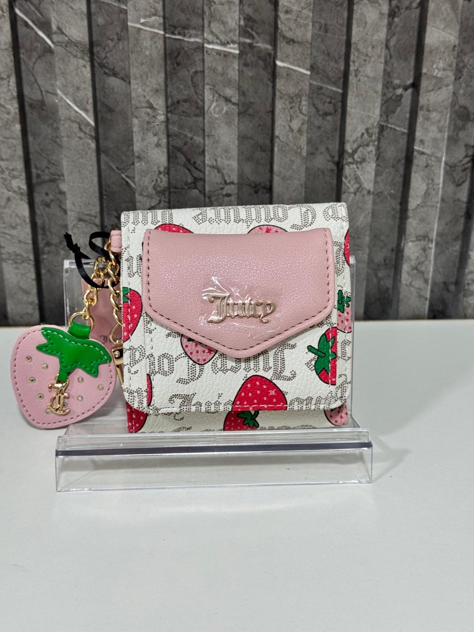 Mini billetera con estampado de frutillas, un estilo juvenil y llamativo, ideal para efectivo y tarjetas