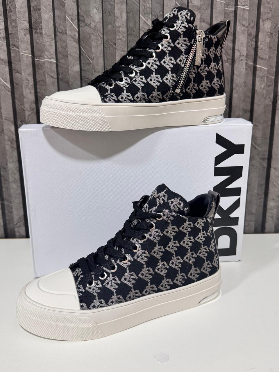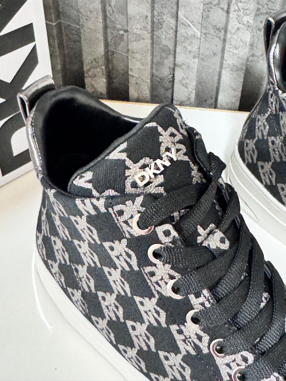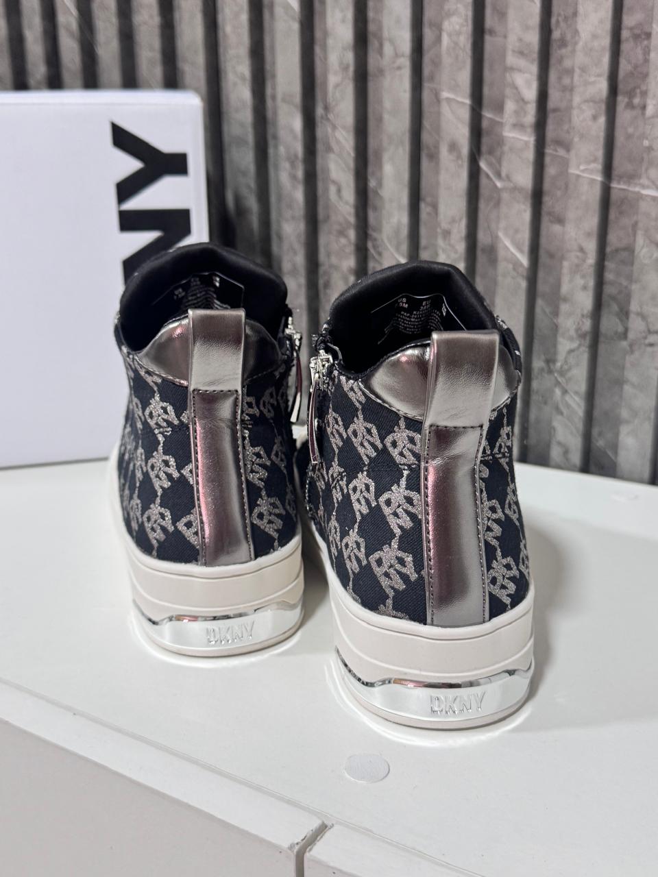 Zapatilla Donna Karan New York, con caña y cierre, monograma en plateado